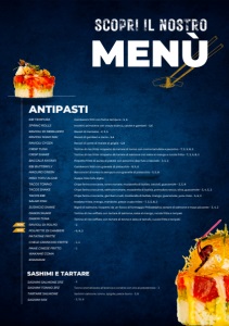 ROLL - 4 PZ. Salmone in tempura con mango e formaggio fresco, top di tataki salmone, salsa guacamole e teriyaki Roll con all’interno pollo in tempura ed avocado, ricoperto da cipolla croccante, mayo lime e salsa teriyaki Roll salmone e avocado - 3 Roll con all'interno gambero in tempura ed avocado, ricoperto da philadelphia, pasta kataifi e salsa teriyaki - 7, 5, 6, 2 Roll con all'interno salmone ed avocado, ricoperto da mayo lime e mandorle tostate - 7, 3, 9 Roll con all'interno salmone ed avocado, ricoperto da philadelphia - 7, 3, 2 Roll con all'interno salmone in tempura, formaggio e zenzero, topping alla rucola e rucola fritta - 7, 3, 5, 8, 2 Roll con all'interno salmone affumicato fatto in casa ed asparago fritto, ricoperti con salsa alla rucola e pasta kataifi - 7, 5, 8 Roll con all'interno salmone cotto alla soia, ricoperto da quinoa croccante e salsa al mango teriyaki - 7, 3, 4, 2 Roll con all'interno gambero in tempura ed avocado, ricoperto da tartare di surimi al formaggio alpigiana ,teriyaki - 7, 4, 5, 8, 2 Roll con all'interno salmone ed avocado, ricoperto con salsa al tartufo - 7, 3 Roll con all'interno surimi e formaggio alpigiana, ricoperto da masago - 7, 4, 6 Roll con all'interno gambero in tempura ed avocado il tutto ricoperto da tartare di salmone e salsa piccante - 7, 3, 5, 6, 8 Tartare di tonno, surimi, avocado, salsa piccante - 2, 3, 6 Gamberi in tempura con avocado, top di tartare di tonno e tartufo - 7, 3, 5, 6 Roll con all'interno salmone avocado.top gambero crudo, bufala, tobiko, pistacchio, teriyaki - 7, 3, 4 Roll con gambero in tempura e mango, sopra tartare di gambero crudo all'arancia e salsa piccante, bufala, pistacchio - 7, 5, 6 Gamberi in tempura, mango, formaggio, top tartare di salmone flambé, miso dolce, pistacchi - 7, 3, 5, 8, 2 Salmone, avocado, copertura salmone, maionese zafferano, pistacchi - 3 Gamberi in tempura, avocado, formaggio fresco, top tartare salmone, teriyaki, fette di mandorle - 7, 5, 6, 8, 2 Riso con fiore di zucca, astice in tempura,avocado ricoperto dalla tartare salmone, yuzu miso, quinoa - 7, 5, 6, 2 Roll consigliato senza salsa di soia, gamberi in tempura, formaggio, avocado, pepe, pecorino - 7, 5, 6, 2 Avocado, philadelpha, top tataki salmone, mango, avocado, pomodoro, yuzu lime, wasabi vero, jalapeño - 2, 3, 2 Salmone, avocado, top salmone, yuzu lime, wasabi vero, jalapeño - 3 Tonno, avocado, top tonno, yuzu miso, tartufo - 3 Salmone fritto, top fette salmone salsa guacamole, pomodoro, teriyaki - 7, 3, 5, 8, 2 Salmone, mango, salmone esterno, teriyaki, salsa guacamole, pistacchio - 3 Gamberi tempura, avocado, stracciatella, croccanti chips wonton, teriyaki Gambero in tempura, copertura avocado, tartare astici, teriyaki - 5, 6, 8 Gambero in tempura, copertura avocado, capesante, salsa teriyaki, Mayo al lampone Salmone, avocado, copertura salmone, scampi, frutto della passione, yuzu miso lime - 2, 3, 6 Gamberi agentina cotti, salsa avocado, top tartare salmone, fiori di zucca in tempura Gamberi con mango e formaggio fresco, top di tataki tonno e cipolla croccante, salsa guacamole e teriyaki Roll con all’interno avocado e formaggio fresco, ricoperto da tartare salmone e mandorle tostate e teriyaki Roll con all’interno salmone, avocado e candito di mirtillo, ricoperto da maionese all’avocado Roll con all’interno tonno ed avocado, ricoperto con salsa tartufo Roll con salmone e avocado, salsa avocado, banana e pistacchio - 7, 3, 1, 9 OYAKO ROLL CHICKEN ROLL CLASSIC SALMON ROLL EBI ROLL SALMON LOVER ROLL SAKE AVOCADO ROLL CRISP ROLL SMOKED SALMON ROLL QUINOA ROLL TIGER ROLL TARTUFO SALMONE ROLL CALIFORNIA ROLL ROCK N ROLL SPICY TUNA ROLL EBI MAGURO ROLL FISH ROLL KAITEN ROLL NEW YUZU STYLE ROLL FLAMBE ROLL HOT ROLL LOBSTER QUINOA ROLL CACIO PEPE ROLL TATAKI ROLL YUZU LOVER ROLL YUZU TARTUFO ROLL QUEEN ROLL DOPPIO SALMON ROLL EBI LOVER ROLL DRAGON ROLL CAPESANTE ROLL SCAMPI ROLL EBI FLOWER KAWAI ROLL KOKO ROLL ROSSO ROLL TARTUFO TONNO ROLL BANANA SALMONE ROLL BLACK/YELLOW ROLL - 4 PZ. FUSION BLACK ROLL SWEET BLACK ROLL KIKKO ROLL EBIFLOWER BLACK ROLL LOBSTER BLACK ROLL STELLA BLACK ROLL SHAKE ZAFFERANO ROLL CACIO ZAFFERANO ROLL YUZU ZAFFERANO ROLL DRAGON BLACK ROLL Roll di riso venere con all'interno salmone in temp. e formaggio philadelphia, sopra salsa al tartufo e pecorino dop. - 7, 3, 5, 2 Riso venere con salmone cotto ed avocado, ricoperto da una spolverata di cocco, crema al pistacc. e scaglie di cioccolato - 2, 3, 2 Riso venere con salmone cotto e mango, formaggio fresco, top di fragola e kataifi - 7, 3, 5, 8, 2 Riso venere con gamberi in tempura ed avocado, sopra tartare di salmone, fiore di zucca in tempura con riduzione al basilico - 7, 3, 5, 6, 8 Riso venere, avocado, astice, gambero in tempura, mozzarella di bufala profumata al lime e formaggio alpigiana allo zafferano - 7, 5, 6, 8, 2 Roll riso venere con tartare salmone, avocado, top burrata, pistacchi e tobiko Roll riso, zafferano, salmone, avocado - 7 Roll consigliato senza salsa di soia, riso zafferano, salmone, avocado, pepe, pecorino - 7, 2 Riso zafferano, gamberi in tempura, avocado, spigola flambé, yuzu kosho, jalapeño - 7, 6 Roll con riso venere, all'interno gambero in tempura, mandorle, sopra tartare di tonno e formaggio alpigiano allo zafferano - FUTO SHAKE FUTO EBI FRUIT ROLL YUZU HOSO HOSO TRUFFLE SUZUKI HOSO FRITTI FUTO EBI BLACK GREEN HOSO ROLL FRITTI - 3/4 PZ. Roll di alga fritta con salmone, formaggio alpigiana, masago ed avocado, ricoperto da tartare di salmone e mayo piccante - 3, 4, 5, 8, 2 Roll di alga fritta con all'interno gambero in tempura, teriyaki mayo piccante - 3, 4, 5, 8, 2 Roll fritto con interno salmone, ricoperto da un fiocco di formaggio philadelphia e frutta del giorno Roll fritto con interno salmone, ricoperto da tartare di salmone aromatizzato all'arancia e mandorle tostate - 3, 8, 2 Roll fritto con salmone in tempura, ricoperto formaggio fresco e tartare branzino, salsa tartufo - 7, 3, 5 Roll fritto con interno salmone, ri